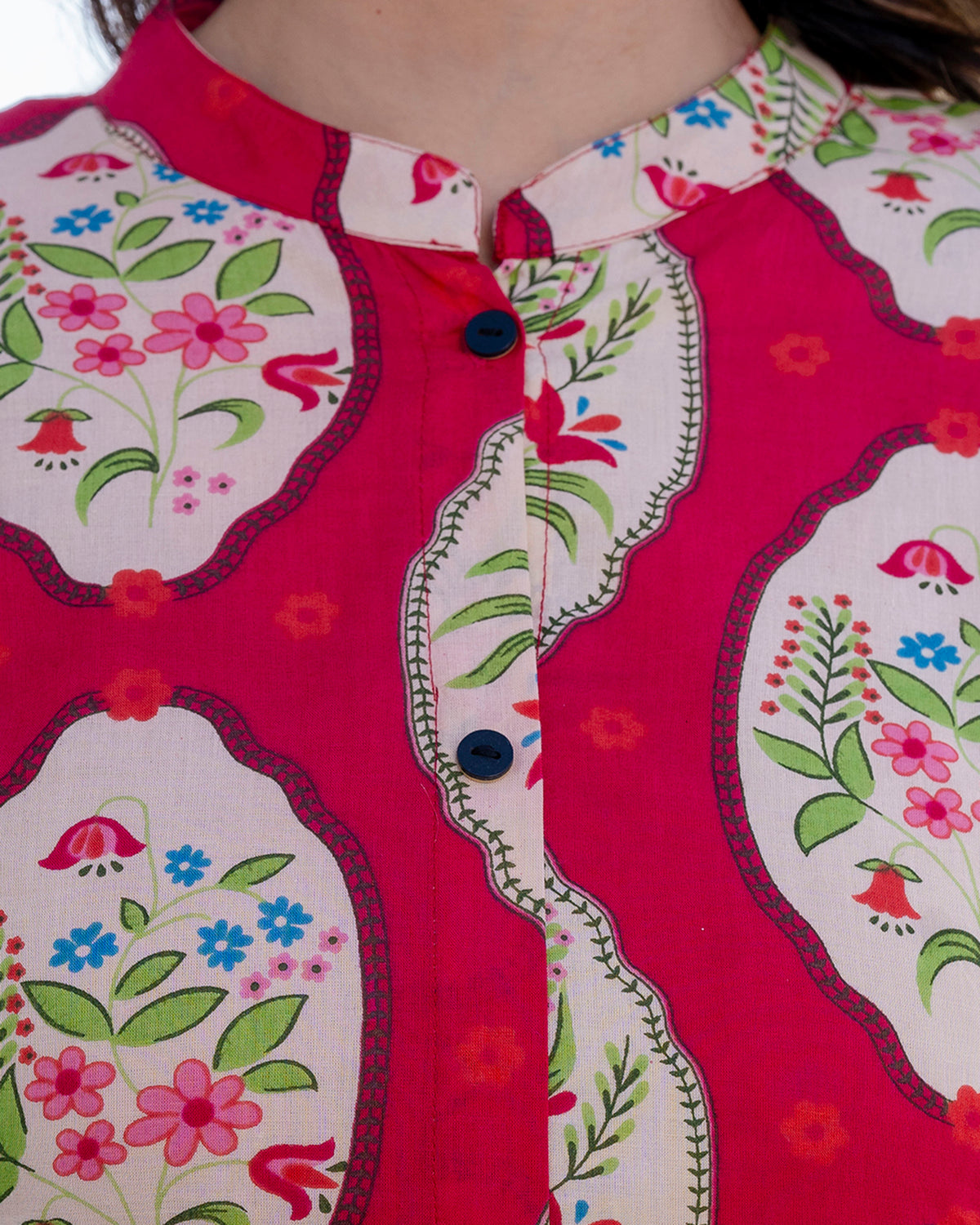 We strongly recommend dry cleaning for the first wash of all hand-printed or block/tie-dyed garments. For subsequent washes, hand wash gently in cold water with a mild detergent and always dry in the shade to preserve the vibrant colours and prevent shrinkage.