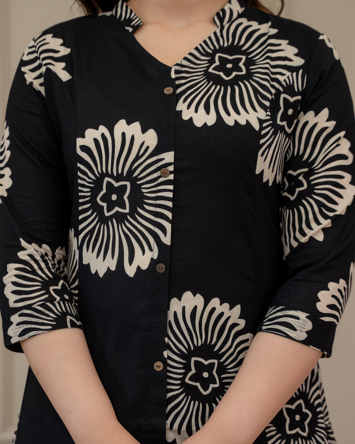 We strongly recommend dry cleaning for the first wash of all hand-printed or block/tie-dyed garments. For subsequent washes, hand wash gently in cold water with a mild detergent and always dry in the shade to preserve the vibrant colours and prevent shrinkage.