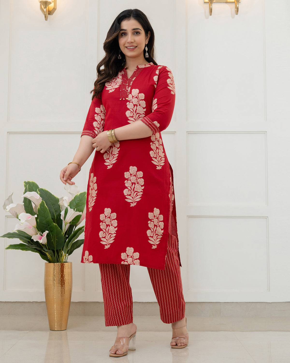 GULNAAR RED FLORAL COTTON KURTA SET